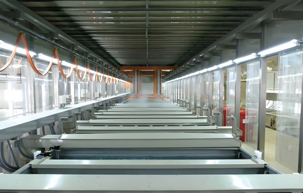 eloxovanie, farbenie (voliteľné), tesnenie a vykladanie. Vybavené automatizovaným zdvíhacím systémom, presnými usmerňovačmi,
